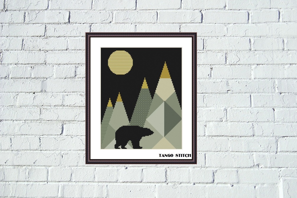 Mountains bear night abstract cross stitch pattern, Tango Stitch