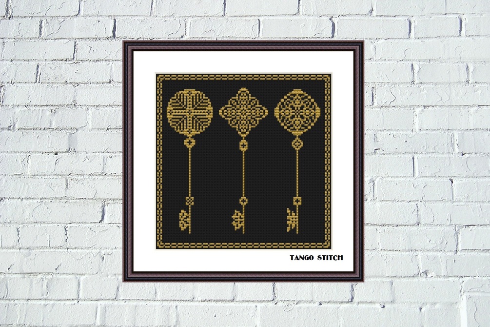 Vintage gold ornament key cute cross stitch hand embroidery pattern, Tango Stitch (1020)